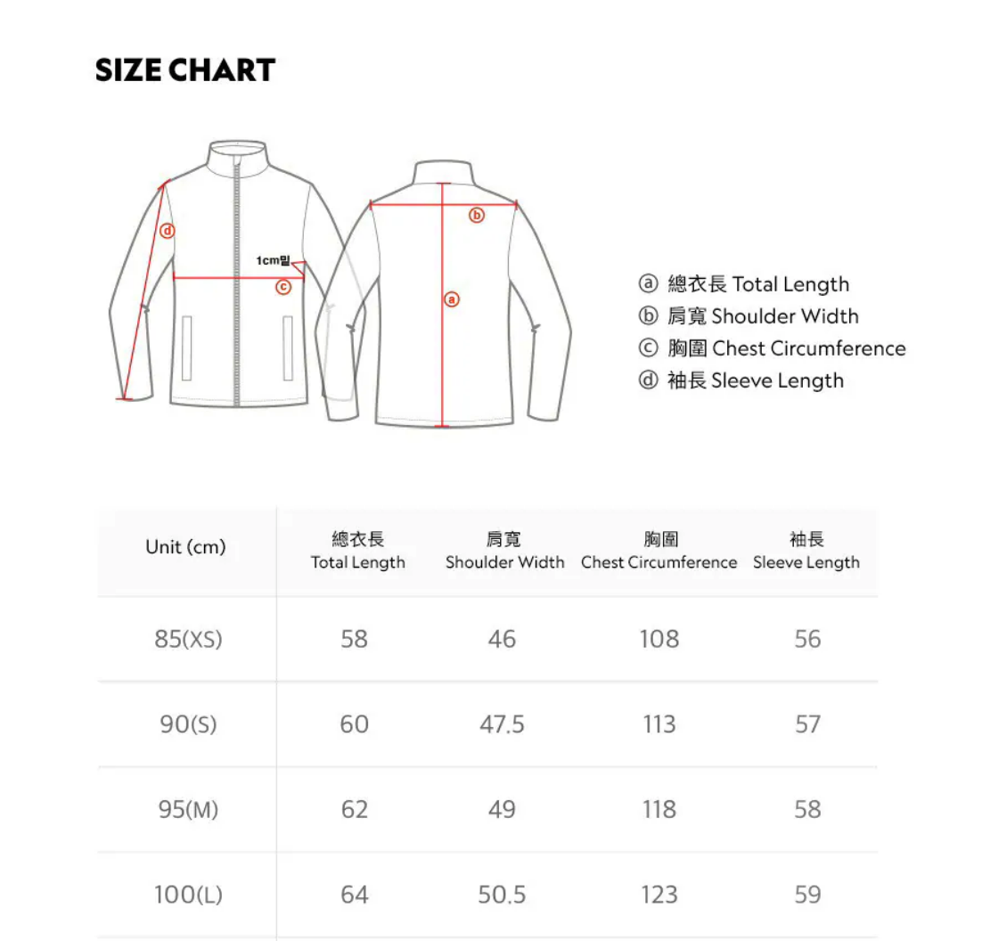 L(100):衣長64cm、胸圍123cm、袖長59cm、肩寬50.5cm