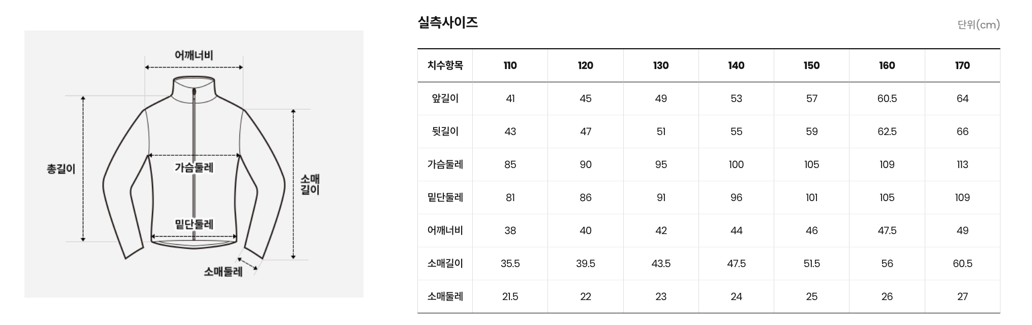 170:肩寬49cm、胸圍113cm、衣長64cm、袖長60.5cm